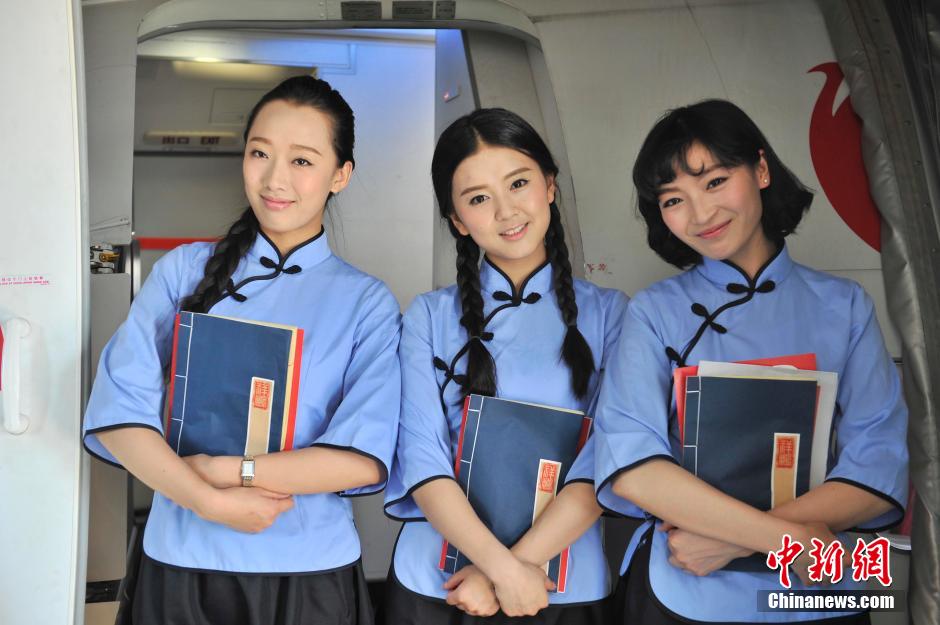 On the fight from Kunming to Sanya, Lucky Air stewardesses dressed in vintage school uniforms celebrate the Youth Day on May 4, 2015. (CNS/ Liu Ranyang)