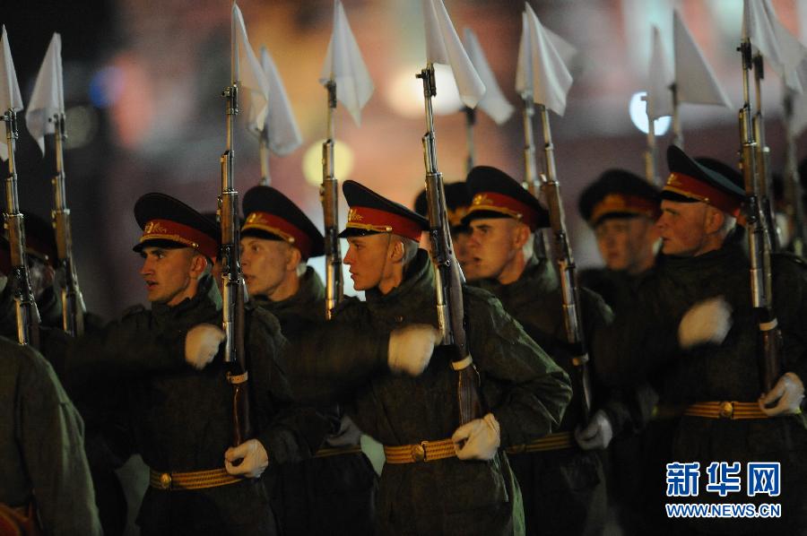 Russian soldiers rehearse on Red Square, Moscow on May 4 for the upcoming 2015 Moscow Victory Day Parade. The parade will take place on May 9, 2015 to commemorate the 70th anniversary of the capitulation of Nazi Germany in 1945. (Xinhua/Dai Tianfang)
