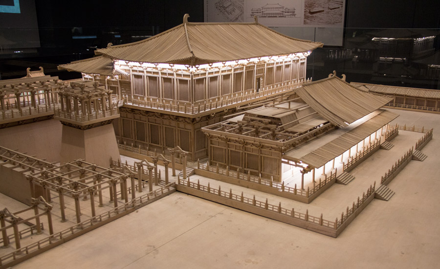 A model of Daming Palace's Linde Hall. Tang Dynasty emperors used Linde Hall for many things: banquets, Taoist ceremonies, and performances by musicians, dancers or acrobats. Daming Palace was the residence for Tang Dynasty emperors in Chang'an, now Xi'an, Shaanxi Province. Photo taken April 9, 2015. [Photo: CRIENGLISH.com/William Wang]