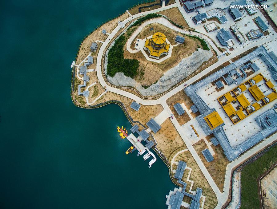 Photo taken on May 5, 2015 shows an aerial view of Fuhai, a man-made lake which is part of the newly-built "Old Summer Palace", also known as "Yuanmingyuan", in the Hengdian World Studios in Dongyang, east China's Zhejiang Province. The first phase of the construction of a new "Old Summer Palace" same sized with the original one in Beijing has been completed. Chunyuan, one of the four major gardens in the Palace occupying most areas, is expected to be open to the public on May 10, 2015. With a total investment of 30 billion yuan (about 4.8 billion U.S. dollars). the rest three gardens will be completed in 2016. (Xinhua/Xu Yu)