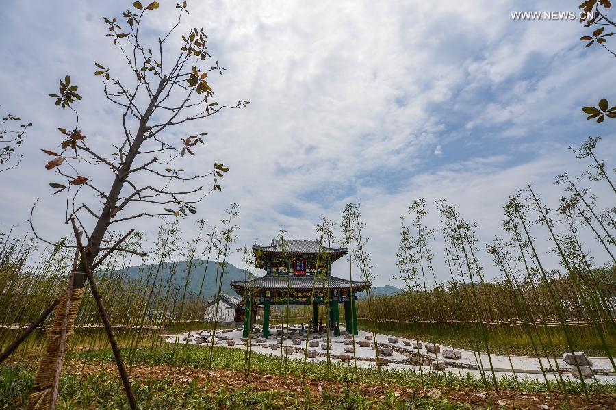 Photo taken on May 5, 2015 shows a pavilion inside the newly-built "Old Summer Palace", also known as "Yuanmingyuan", in the Hengdian World Studios in Dongyang, east China's Zhejiang Province. The first phase of the construction of a new "Old Summer Palace" same sized with the original one in Beijing has been completed. Chunyuan, one of the four major gardens in the Palace occupying most areas, is expected to be open to the public on May 10, 2015. With a total investment of 30 billion yuan (about 4.8 billion U.S. dollars). the rest three gardens will be completed in 2016. (Xinhua/Xu Yu)