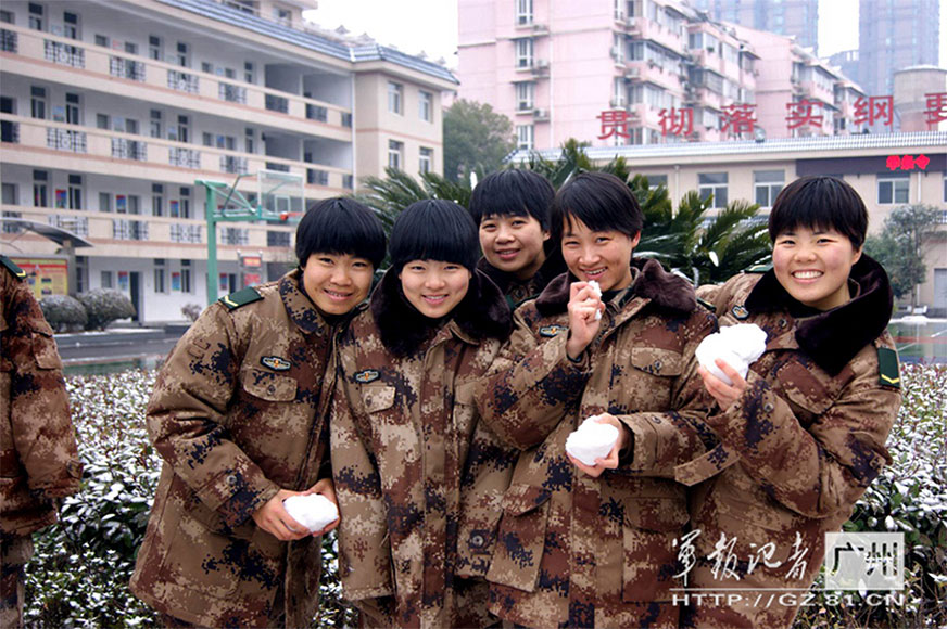 Several female soldiers from south China's Hainan province have a snowball fight for the first time in their lives. (Photo/GZ.81.CN)