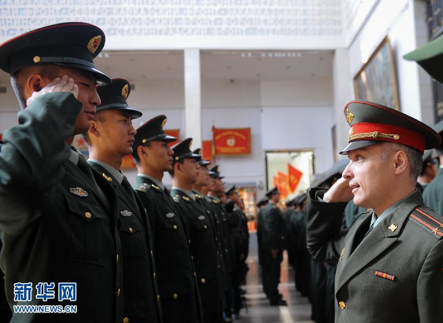 Chinese guards of honor were awarded medals Wednesday by the Russian Defense Ministry to commemorate their participation in the upcoming Victory Day parade on May 9. The guards of honor of the three services of the Chinese People's Liberation Army, consisting of 112 members, attended the award ceremony in the exhibition hall of the Central Armed Forces Museum. (Photo/Xinhua)