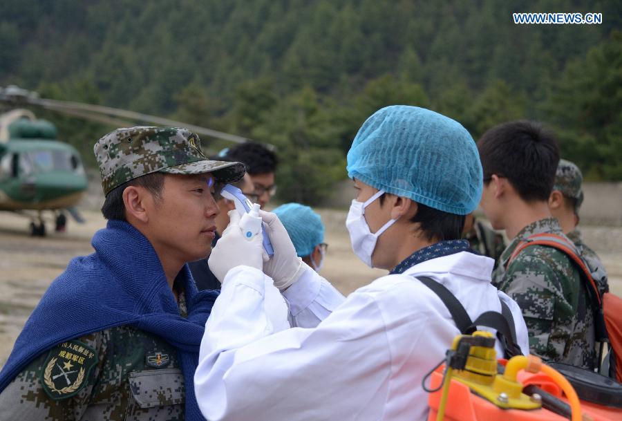 | An inspection and quarantine worker measures body temperature for a helicopter crew member in Gyirong County, southwest China's Tibet Autonomous Region, May 6, 2015. Three helicopters from China's air force flew to Nepal on Wednesday morning to help with transportation and rescue. (Xinhua/Wang Shoubao) |