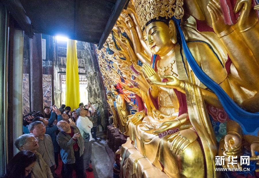 Experts from cultural sector and research institutions jointly carry out a comprehensive inspection of the restored Dazu Buddhist statue in Chongqing on May 5, 2015. The restoration of the Buddhist statue which lasted eight years was finalized in May. (Xinhua/Liu Chan)