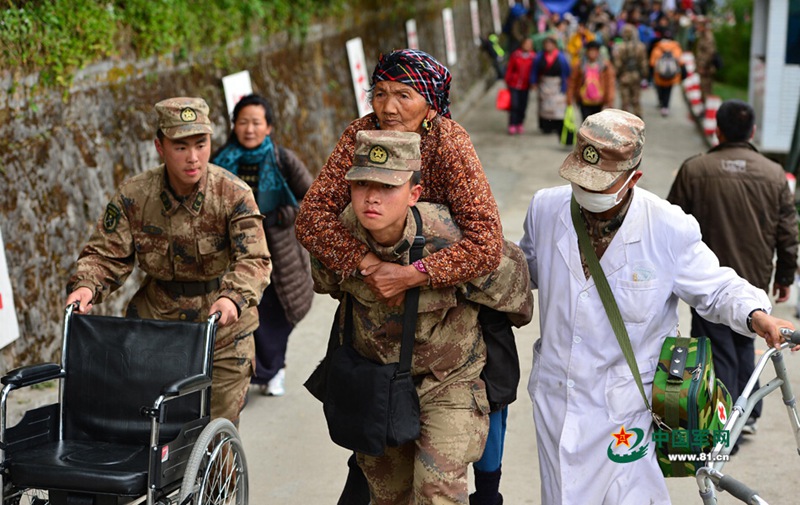 A team of 125 militiamen and 150 frontier guards conduct earthquake relief in Riongxar Town, Tingri County at the foot of Mt. Qomolangma after an 8.1-magnitude quake shook Nepal on April 25, which also affected the southwestern part of Tibet. (Photo/ Zhang Zhen)