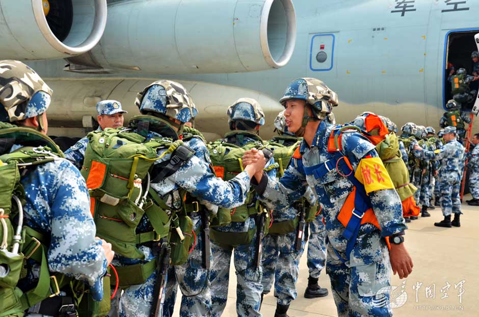 Airborne troops of the People's Liberation Army (PLA) conduct parachuting training recently. The IL-76 plane they took is a large Russian-made, four-engine multipurpose aircraft. (CNS Photo)