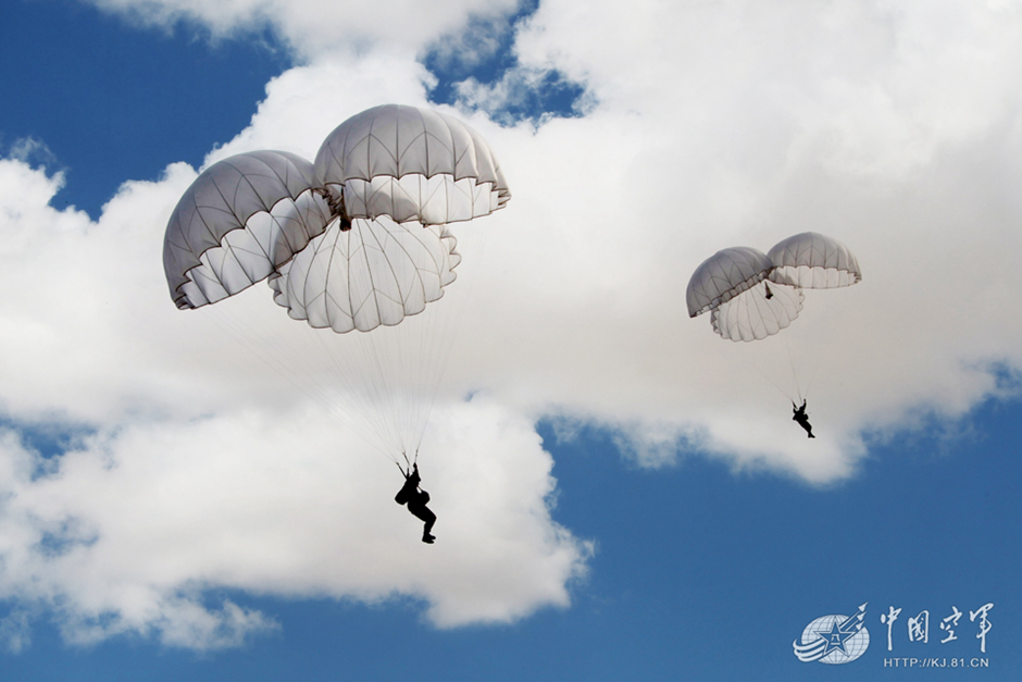 | Airborne troops of the People's Liberation Army (PLA) conduct parachuting training recently. The IL-76 plane they took is a large Russian-made, four-engine multipurpose aircraft. (CNS Photo) |