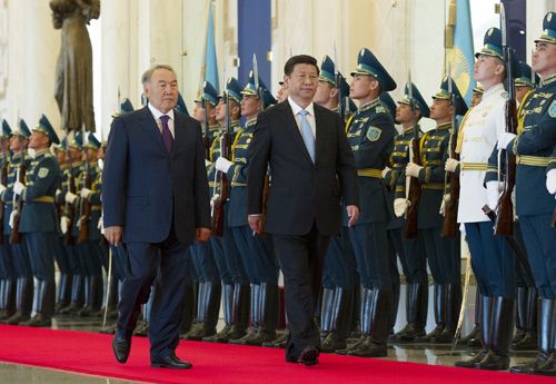 A grand red-carpet welcome ceremony was held in the office of Nazarbayev on Sept. 7. Afterwards, accompanied by Nazarbayev, Xi inspected the honor guard while a military band played the national anthems of both countries.