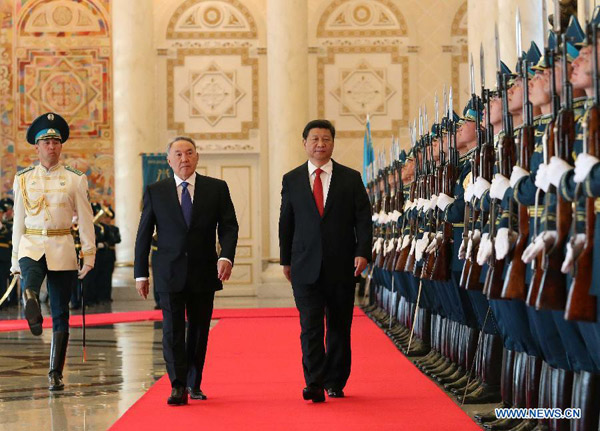 | Chinese President Xi Jinping (3rd L, front) attends a welcoming ceremony held by Kazakh President Nursultan Nazarbayev (2nd L) in Astana, Kazakhstan, May 7, 2015. (Xinhua/Liu Weibing) |