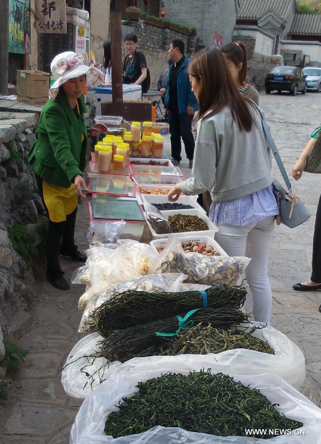 Tourists purchase mountain products at Chuandixia village on the outskirts of Beijing, capital of China, May 9, 2015. Chuandixia village, a mountainous village built in the Ming and Qing dynasties, is listed as the cultural heritage under the key protection of Beijing. The residential buildings in the village have maintained the original housing style. (Xinhua/Li Xin)
