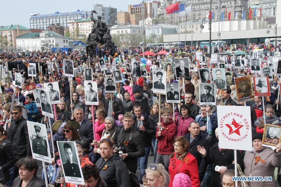 People holding photos of martyrs take part in the military parade marking the 70th anniversary of the victory in the Great Patriotic War, in Vladivostok, Russia, May 9, 2015. (Xinhua/Valery)