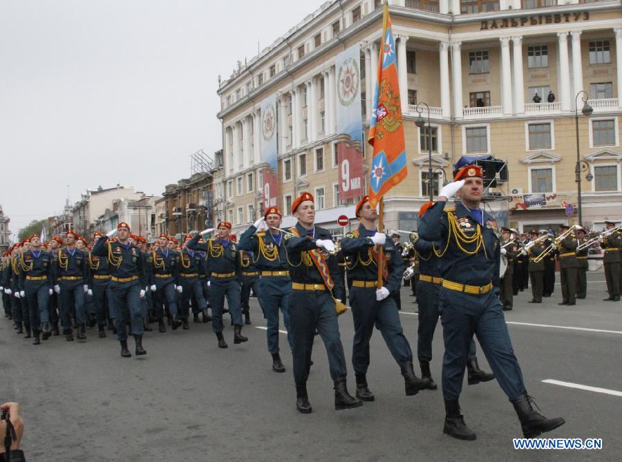 Russian soldiers take part in the military parade marking the 70th anniversary of the victory in the Great Patriotic War, in Vladivostok, Russia, May 9, 2015. (Xinhua/Zhu Yushu)
