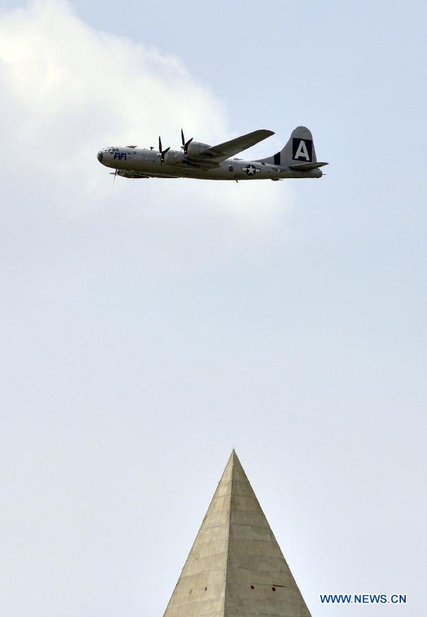 World War II vintage aircraft fly near the Washington Monument in Washington D.C., capital of the United States, May 8, 2015. Diverse arrays of U.S. World War II aircraft flew over the capital Washington D.C. Friday, commemorating the 70th anniversary of World War II victory in Europe. (Xinhua/Yin Bogu)