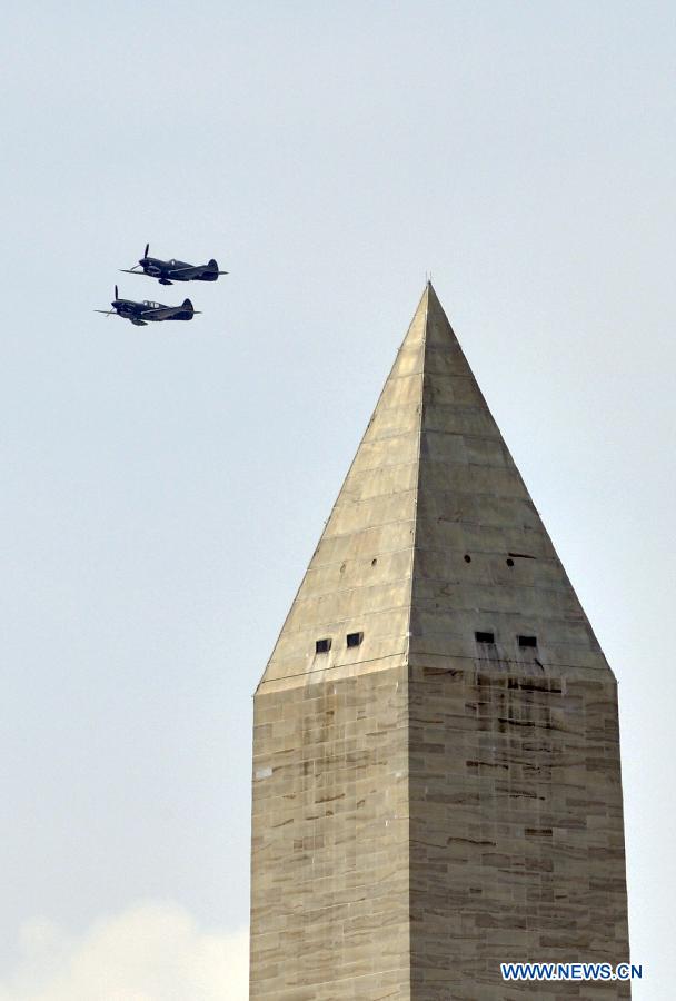 World War II vintage aircraft fly near the Washington Monument in Washington D.C., capital of the United States, May 8, 2015. Diverse arrays of U.S. World War II aircraft flew over the capital Washington D.C. Friday, commemorating the 70th anniversary of World War II victory in Europe. (Xinhua/Yin Bogu)