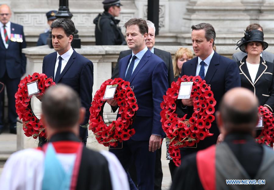 British Prime Minister David Cameron, outgoing Liberal Democratic Party leader Nick Clegg and outgoing opposition Labour Party leader Ed Miliband (Central Row, from R to L), attend a VE Day service of remembrance at the Cenotaph on Whitehall to commemorate the 70th anniversary of the end of the World War II in Europe in London, Great Britain, on May 8, 2015. (Xinhua/Han Yan)