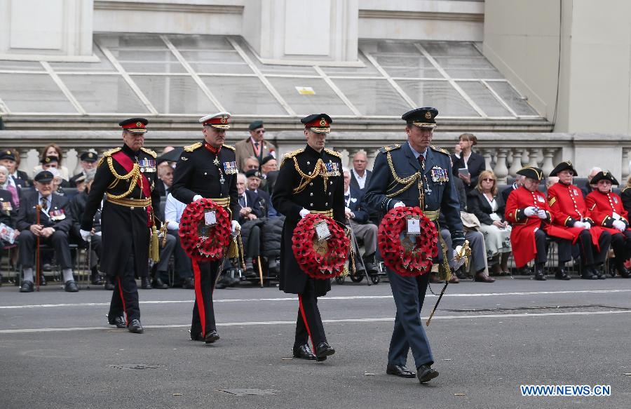 Military soldiers take part in a VE Day service of remembrance at the Cenotaph on Whitehall to commemorate the 70th anniversary of the end of the World War II in Europe in London, Great Britain, on May 8, 2015. (Xinhua/Han Yan)