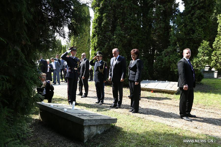Slovak President Andrej Kiska (3rd R) attends a commemoration event of the 70th anniversary of World War II victory in Europe held in the Central Military Cemetery of Royal Romanian Amry and Red Army in Zvolen, central Slovakia, May 8, 2015. (Xinhua/Erik Adamson)