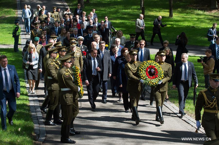 People attend the commemoration marking the 70th anniversary of World War II victory in Europe in Vilnius, Lithuania, on May 8, 2015. (Xinhua/Alfredas Pliadis)