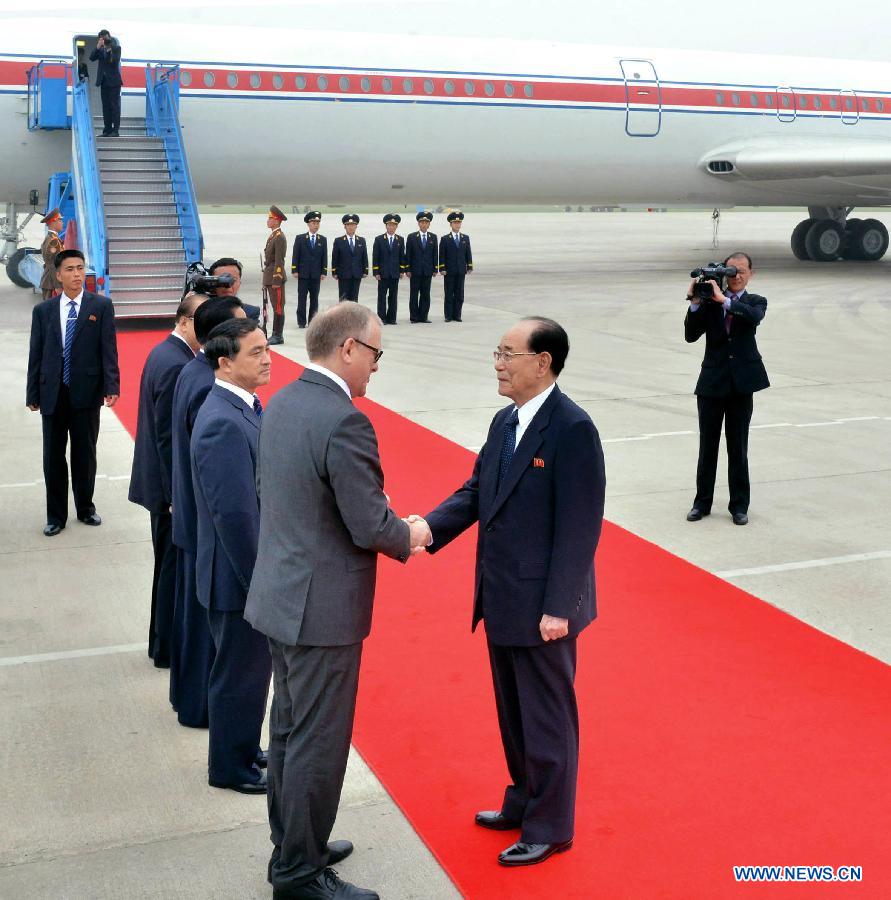 Photo provided by Korean Central News Agency (KCNA) on May 8, 2015 shows Kim Yong Nam (front R), president of the Presidium of the Supreme People's Assembly of the Democratic People's Republic of Korea (DPRK), left Pyongyang by a special plane on Friday to take part in the celebrations of the 70th anniversary of the victory in the Great Patriotic War to be held in Moscow, capital city of Russia. (Xinhua/KCNA)