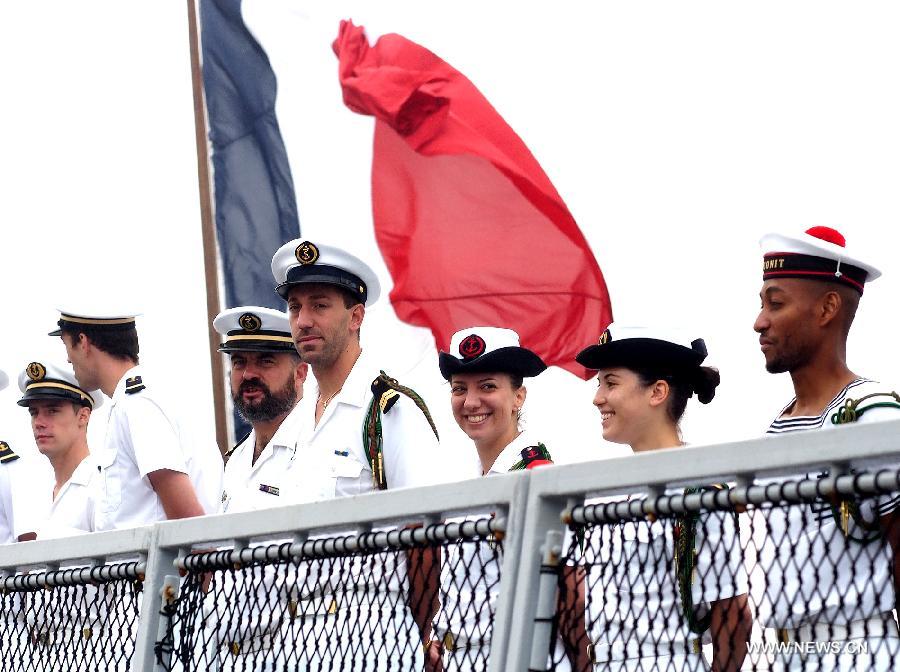 French navy soldiers arrive at the Wusong naval port in Shanghai, east China, May 9, 2015. A French naval taskforce consisted of the Mistral-class protection and command ship Dixmude and the frigate Aconit arrived in Shanghai on Saturday for a 7-day visit. (Xinhua/Chen Fei)