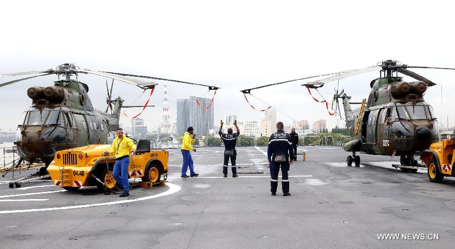 Helicopters are seen on the deck of French Mistral-class protection and command (BPC) ship Dixmude at the Wusong naval port in Shanghai, east China, May 9, 2015. A French naval taskforce consisted of the BPC ship Dixmude and the frigate Aconit arrived in Shanghai on Saturday for a 7-day visit. (Xinhua/Chen Fei)