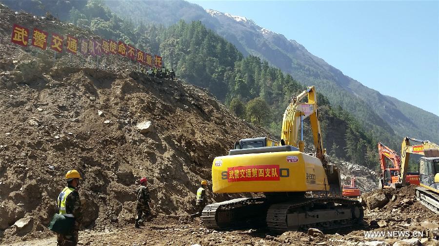 Excavators work to clear a landslide-disrupted roadway linking Gyirong Town and Gyirong port in Xigaze City, southwest China's Tibet Autonomous Region, May 8, 2015. The traffic of this 27-kilometer-long road was resumed on Friday after a 13-day rush repair. The region was severely hit by the April 25 Nepal earthquake. (Xinhua/Pi Feng)