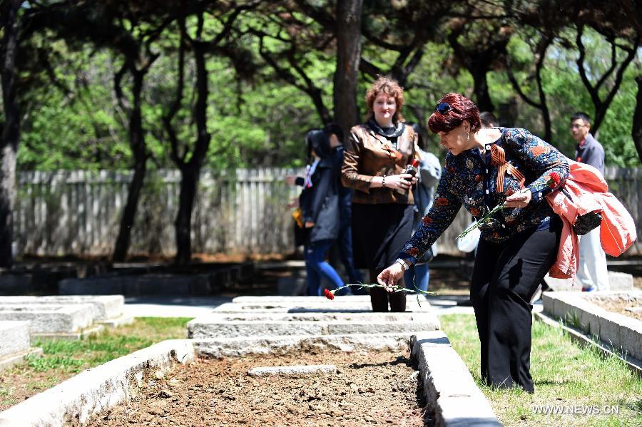 A woman lays a flower during a ceremony to commemorate the 70th anniversary of the victory of the World Anti-Fascism War, at the Soviet Martyrs' Park in Shenyang, capital of northeast China's Liaoning Province, May 9, 2015. (Xinhua/Pan Yulong)