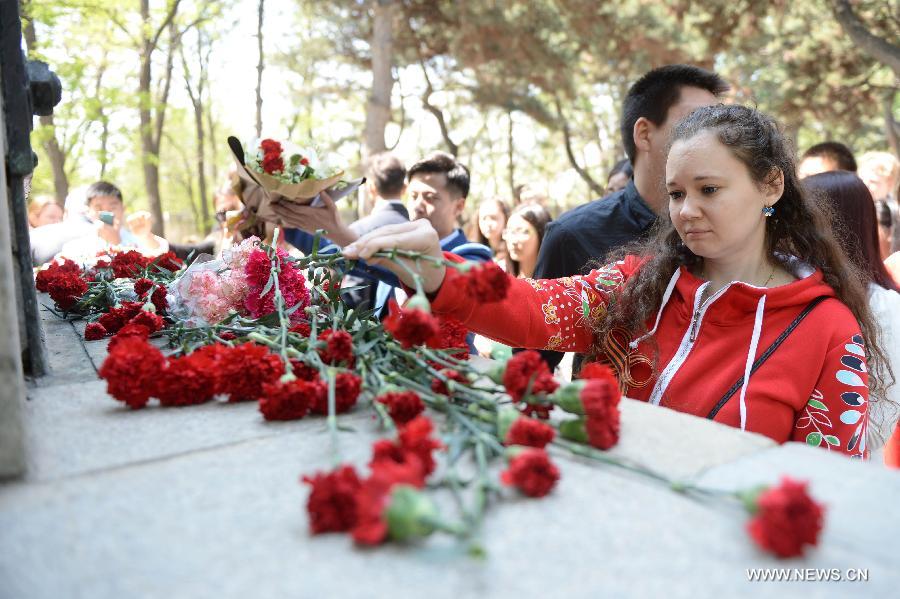 People present flowers during a ceremony to commemorate the 70th anniversary of the victory of the World Anti-Fascism War, at the Soviet Martyrs' Park in Shenyang, capital of northeast China's Liaoning Province, May 9, 2015. (Xinhua/Pan Yulong)
