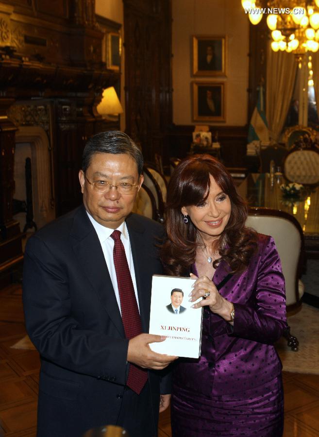 Zhao Leji (L), head of the Organization Department of the Communist Party of China (CPC) Central Committee and a member of the Political Bureau of the CPC Central Committee, meets with Argentina's President Cristina Fernandez in Buenos Aires, Argentina, on May 6, 2015. Zhao Leji is on an official visit to Argentina from May 6 to 8. (Xinhua/Ye Shuhong)