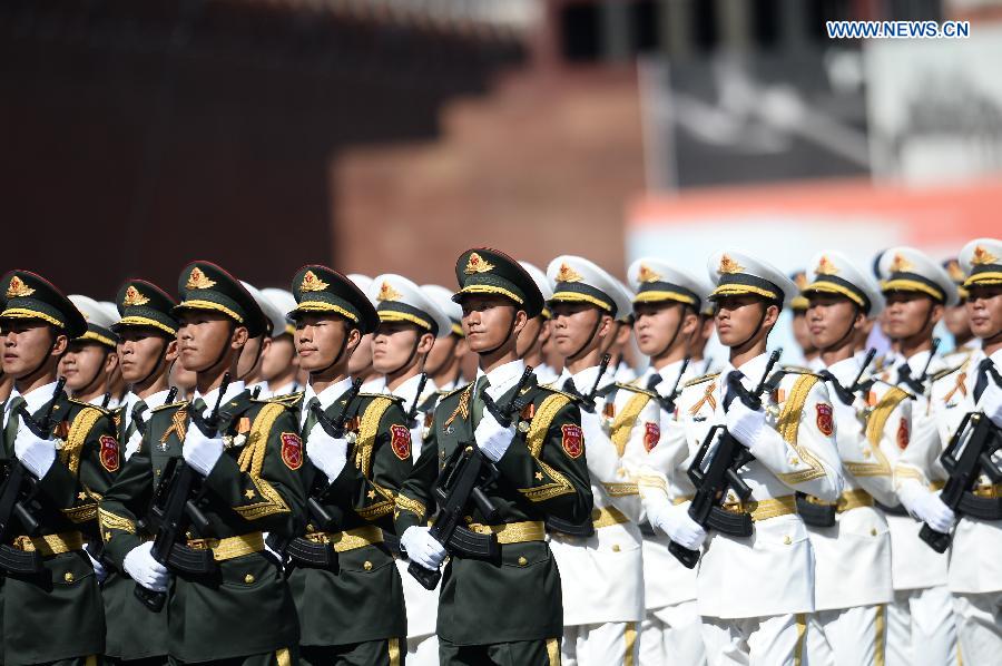 The guard of honor of the three services of the Chinese People's Liberation Army (PLA) take part in the military parade marking the 70th anniversary of the victory in the Great Patriotic War, in Moscow, Russia, May 9, 2015. (Xinhua/Jia Yuchen)
