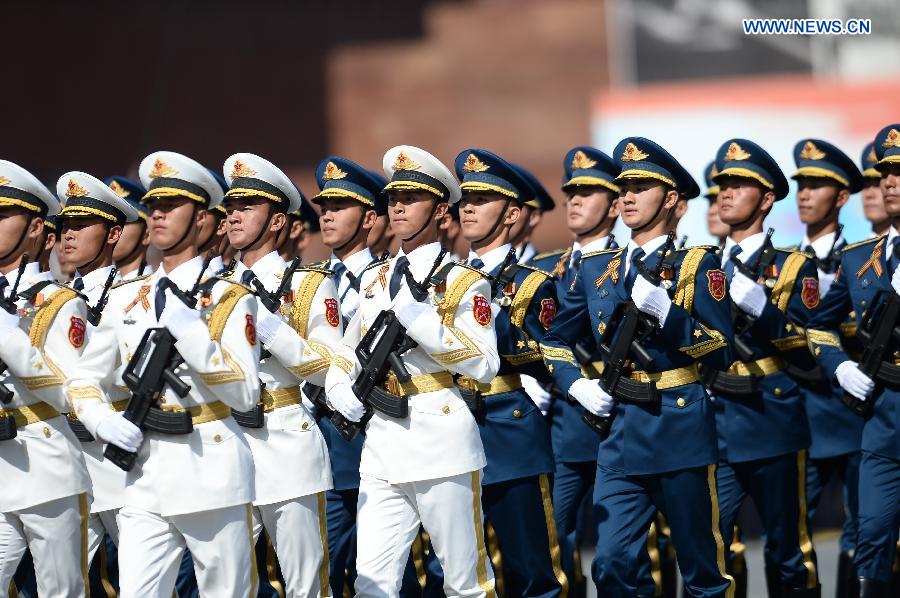 The guard of honor of the three services of the Chinese People's Liberation Army (PLA) take part in the military parade marking the 70th anniversary of the victory in the Great Patriotic War, in Moscow, Russia, May 9, 2015. (Xinhua/Jia Yuchen)
