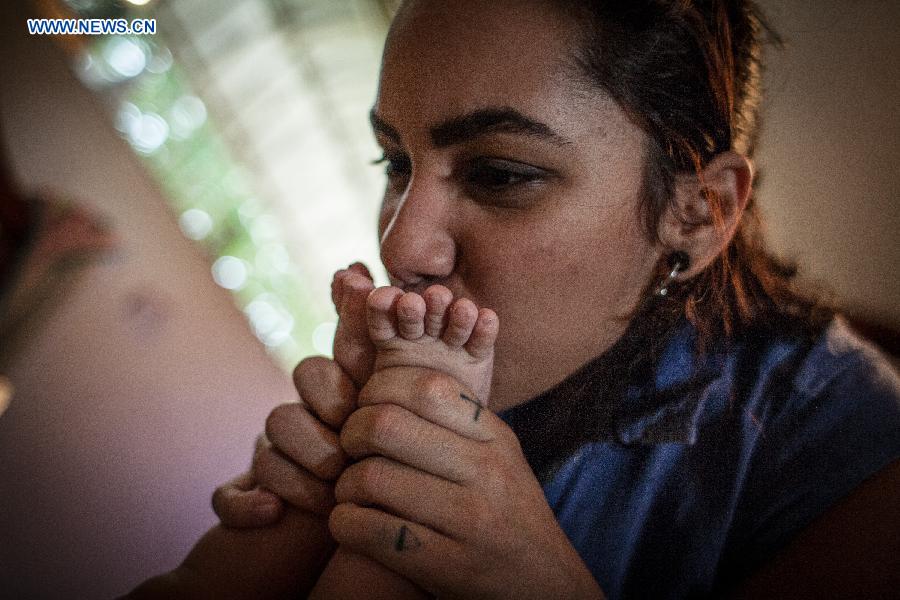 Andrea Romero kisses the feet of her daughter Ananda in Caracas, capital of Venezuela, May 9, 2015, the eve of the Mother's Day. Andrea Romero, a makeup technician and visual editor who gave birth to Ananda at 21, is fully dedicated to her daughter. (Xinhua/Boris Vergara)