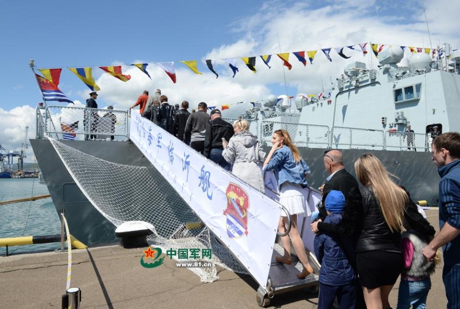 Visitors look at China’s missile frigate Linyi during an open day at the Novorossiysk naval base, Russia, May 9, 2015. More than 3,000 visitors and Russian navy officials boarded the ship over two days. The ship arrived for the celebration of the 70th anniversary of the Soviet victory over Nazi Germany in WWI and will leave Novorossiysk for the Mediterranean Sea, where naval drills with Russia, dubbed Joint Sea 2015, will take place. (Photo: China News Service/Li Jing)
