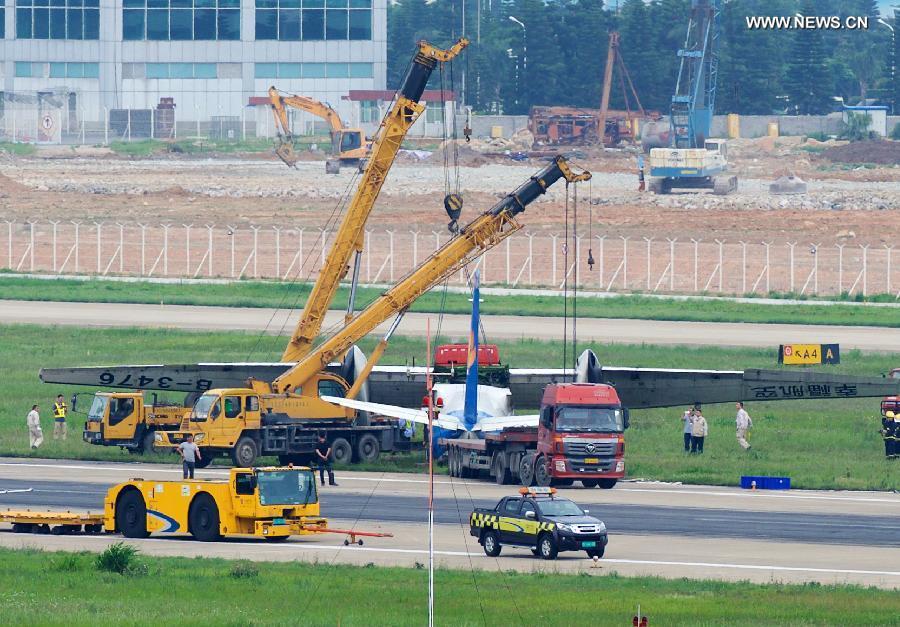 Photo taken on May 10, 2015 shows the accident scene where a plane skidded off the runway at Changle International Airport in Fuzhou, capital of southeast China's Fujian Province. A Joyair plane skidded off the runway while taxiing at Changle International Airport on Sunday, leaving five passengers slightly injured. (Xinhua/Jiang Kehong)