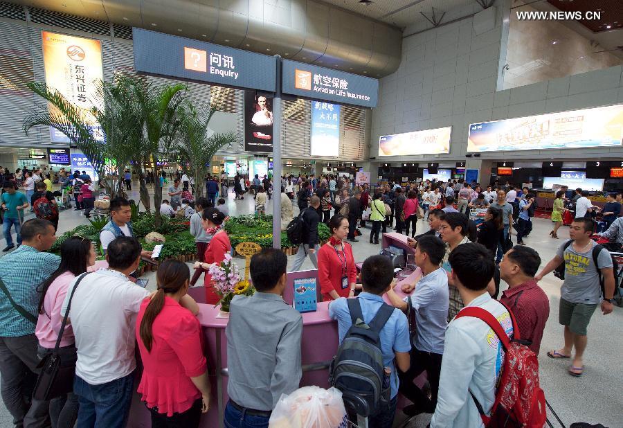 Passengers gather at the Enquiry at Changle International Airport in Fuzhou, capital of southeast China's Fujian Province, May 10, 2015. Joyair flight JR1529 skidded off the runway while taxiing at the airport on Sunday, leaving five passengers slightly injured. Most flights departing from the airport were delayed or cancelled. (Xinhua/Jiang Kehong)