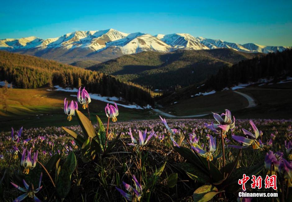 Nurtured by water released by the melting of snow, all kinds of plants on the Altai Mountains are starting to bloom. In the next two month, more kinds of flowers will bloom in Kanas, which is known as the "God's backyard garden." (Chinanews/Lei Dongxiang)