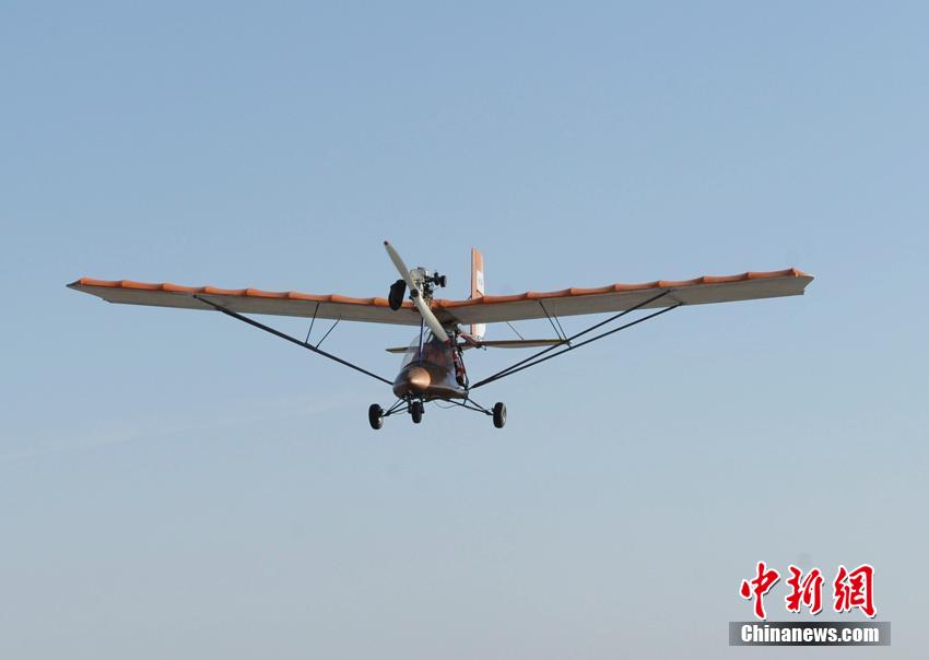 | 45-year-old Yang Shijun successfully flies his self-made light plane to the height of 200 meters in Changchun, northeast China’s Jilin province on May 10, 2015. His plane had made two trail flights previously. After the flight in May 10, the plane had completed 2.5 hours flight time and 10 taking-offs and landings. According to Yang, he and his friends are making three two-seater planes now, so as to enjoy more fun of flying. (Chinanews/Zhang Yao) |