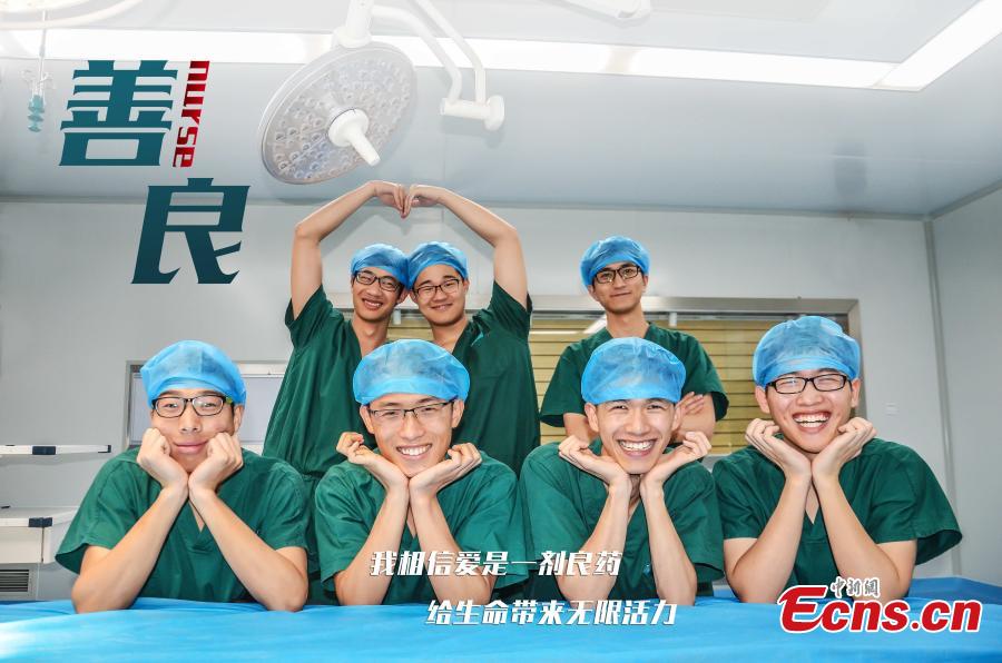 | Would-be male nurses studying at the medical school of Jinhua Polytechnic, located in East China’s Zhejiang province, pose for photos to mark International Nurses Day on May 12, 2015. The students, who are completing a nursing program, say they are proud to work in the female-dominated profession. Official data released by the health authority showed there were 45,000 registered male nurses in 2012, an increase from 39,000 in 2009. (Photo: China News Service/Lu Huiping) |