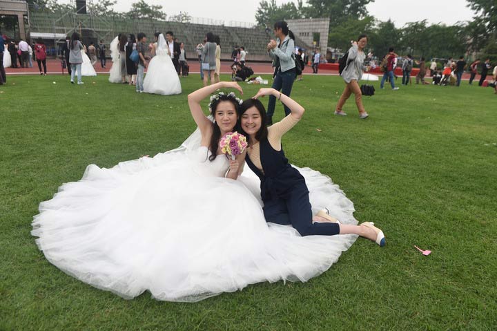 A group wedding for 360 couples is held in Zhejiang University, east China's Zhejiang province, May 10, 2015. Last Sunday was also the 118th founding anniversary of Zhejiang University. Family members, teachers and students witnessed the happiness of the 360 couples who have graduated from the university. (Photo/zjol.com.cn)
