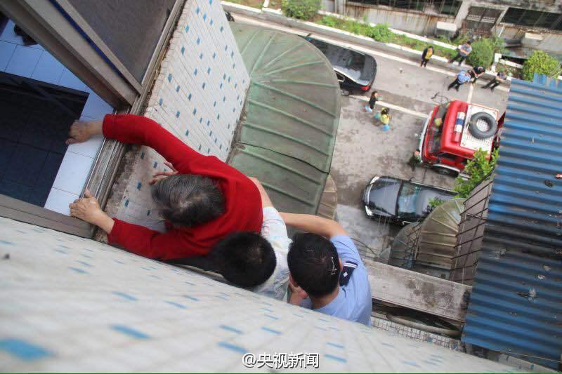 A man holds a senior who was hung out of the window of the 6th floor of an apartment building in Yichang, central China's Hubei province on May 13, 2015 until local policemen come to their rescue. The senior who forgot to take the key to home was attempting to enter through windows when the accident happened. (Official micro blog of CNTV/Wei Tie)