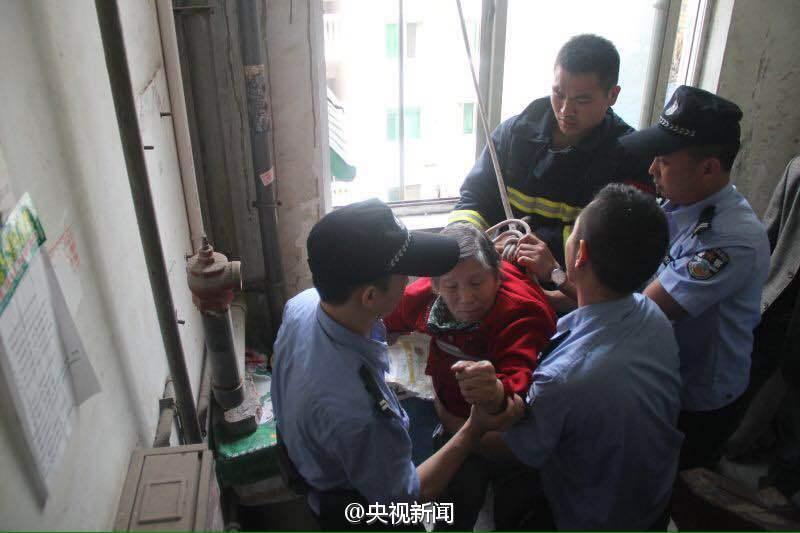 | A man holds a senior who was hung out of the window of the 6th floor of an apartment building in Yichang, central China's Hubei province on May 13, 2015 until local policemen come to their rescue. The senior who forgot to take the key to home was attempting to enter through windows when the accident happened. (Official micro blog of CNTV/Wei Tie) |
