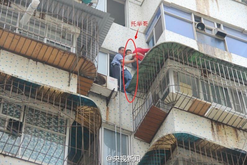 A man holds a senior who was hung out of the window of the 6th floor of an apartment building in Yichang, central China's Hubei province on May 13, 2015 until local policemen come to their rescue. The senior who forgot to take the key to home was attempting to enter through windows when the accident happened. (Official micro blog of CNTV/Wei Tie)