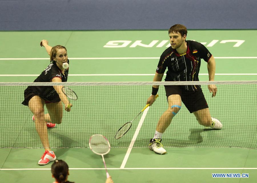 Germany's Michael Fuchs/Birgit Michels (L) play against China's Zhang Nan/Zhao Yunlei during the quarterfinal between China and Germany at 2015 Sudirman Cup BWF World Mixed Team Championships in Dongguan, south China's Guangdong Province, May 14, 2015. (Xinhua/Meng Yongmin)