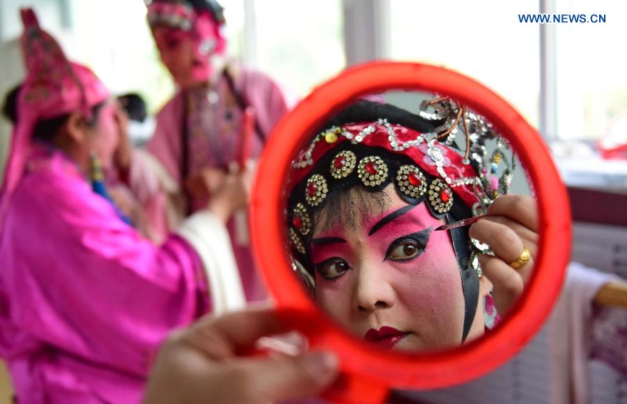 People make up before performing a Chinese opera in a cultural center of a community in Xingtai City, north China's Hebei Province, May 13, 2015. (Xinhua/Yang Shiyao)