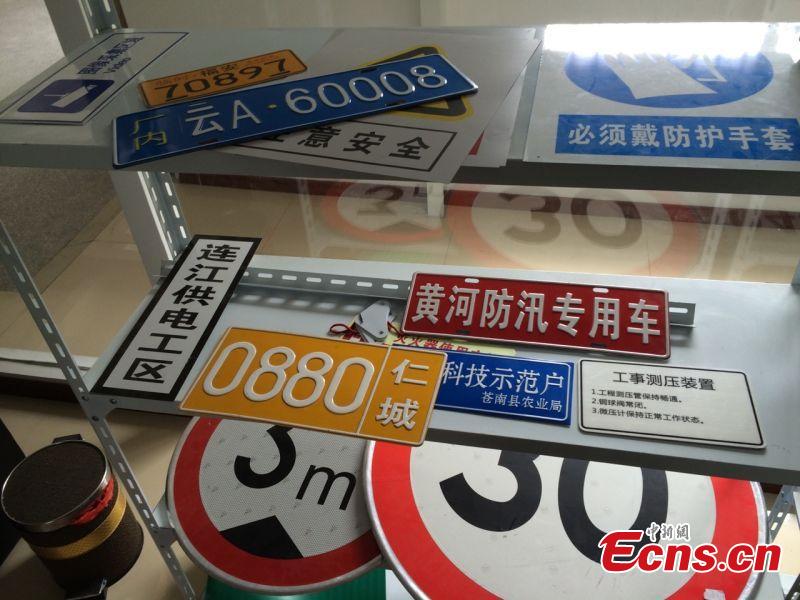 Fake car number plates, and certificates and tools used to make them on display at a press conference held by the Public Security Department of Guizhou Province, May 13, 2015. Guizhou police busted a gang producing and selling various fake car number plates and certificates across the country. They detained 26 suspects and confiscated 106,000 fake items, ranging from academic diplomas to business licenses. The amounts of money involved reached 26 million yuan($4.2 million). (Photo: China News Service/Zhong Xin)