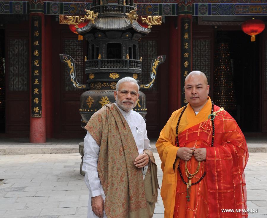 Indian Prime Minister Narendra Modi (L), accompanied by abbot Kuanxu, visits the Daxingshan Temple in Xi'an, capital of northwest China's Shaanxi Province, May 14, 2015. Modi arrived in Xi'an Thursday for an official visit to China. (Xinhua/Ding Haitao)