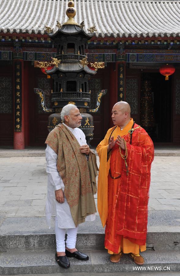 Indian Prime Minister Narendra Modi (L), accompanied by abbot Kuanxu, visits the Daxingshan Temple in Xi'an, capital of northwest China's Shaanxi Province, May 14, 2015. Modi arrived in Xi'an Thursday for an official visit to China. (Xinhua/Ding Haitao)