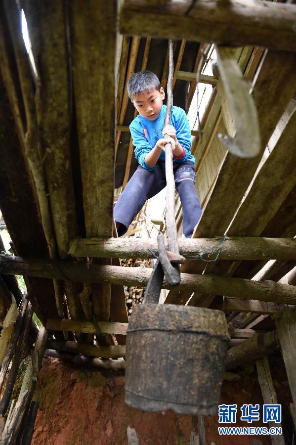 Yang Dongchao lowers a bucket into the pigsty to feed the pigs.