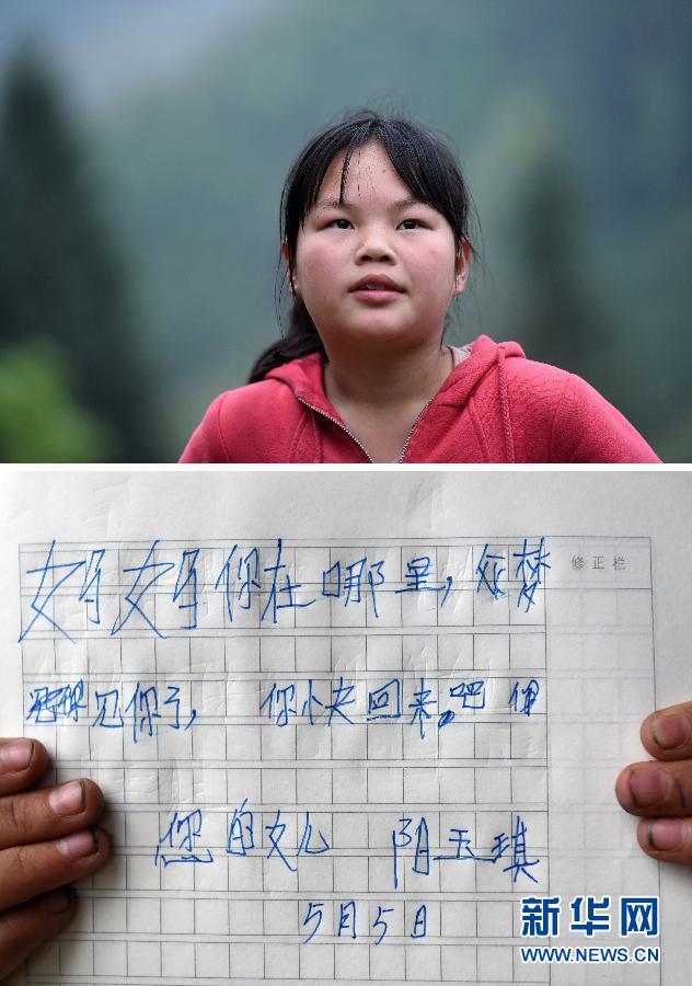 Yang Yvqi, 12, is a student at Dongsheng Primary School. Her mother left her when she was eighteen months old. Her father went to look for work as a migrant worker. She now lives with her 79-year-old grandpa. She wrote to her mother: " Mother, where are you? I dreamed of you and wished you would come back soon!"